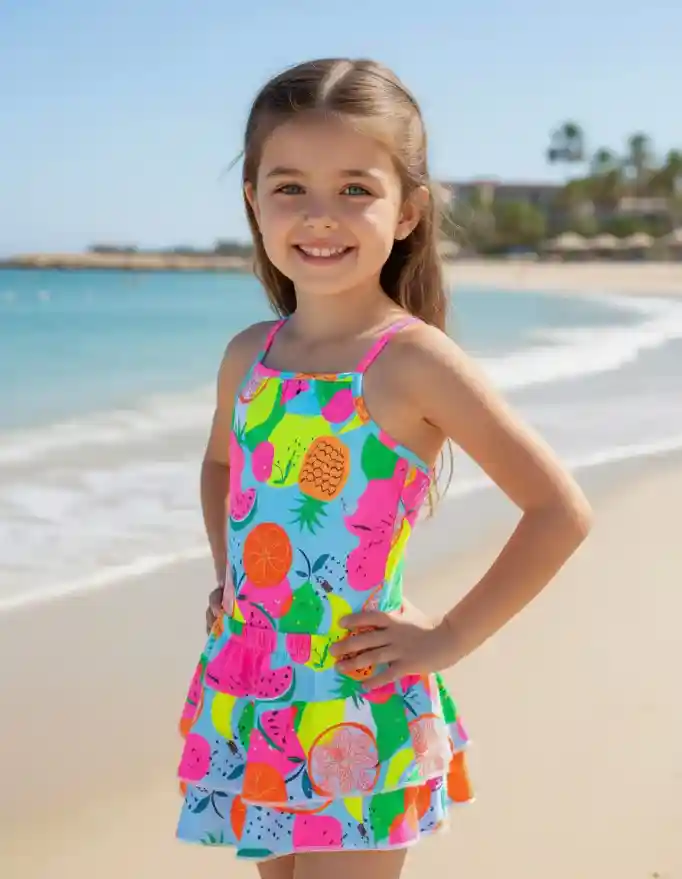 Con protección UV proporcionando una cobertura adecuada, ideal para proteger la piel sensible de las niñas del sol, sin sacrificar la libertad de movimiento.
