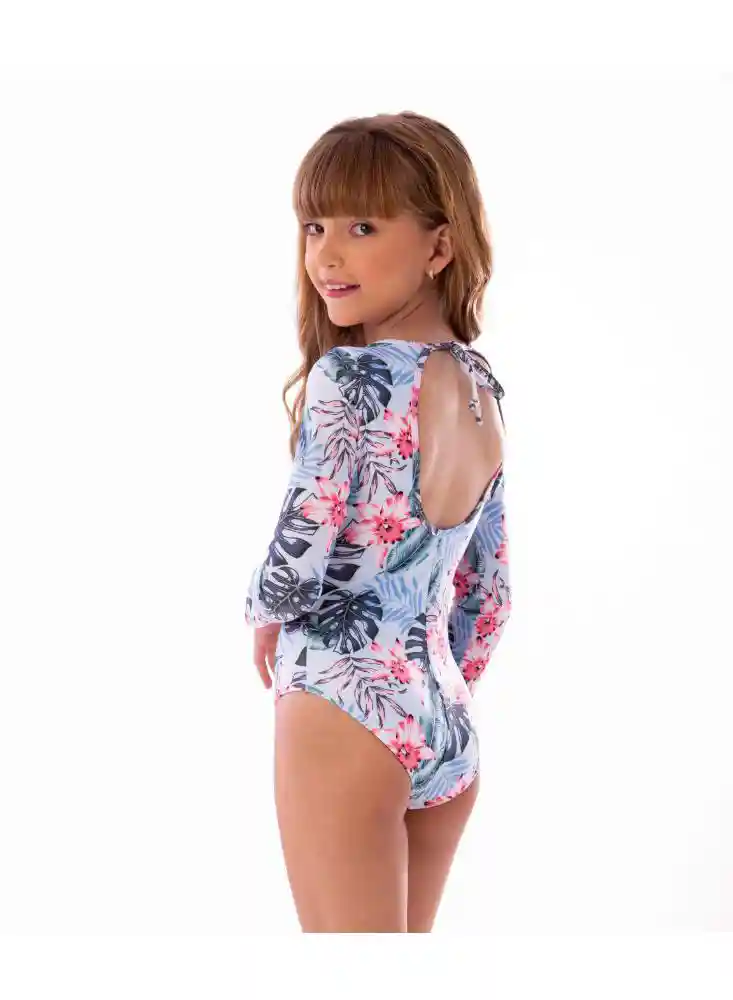 Vestido de baño entero manga larga cuello redondo, con escote profundo en espalda y tiras para amarre. Tela gruesa de calidad (no se motea) y estampados de alta resistencia la cloro y desgaste.